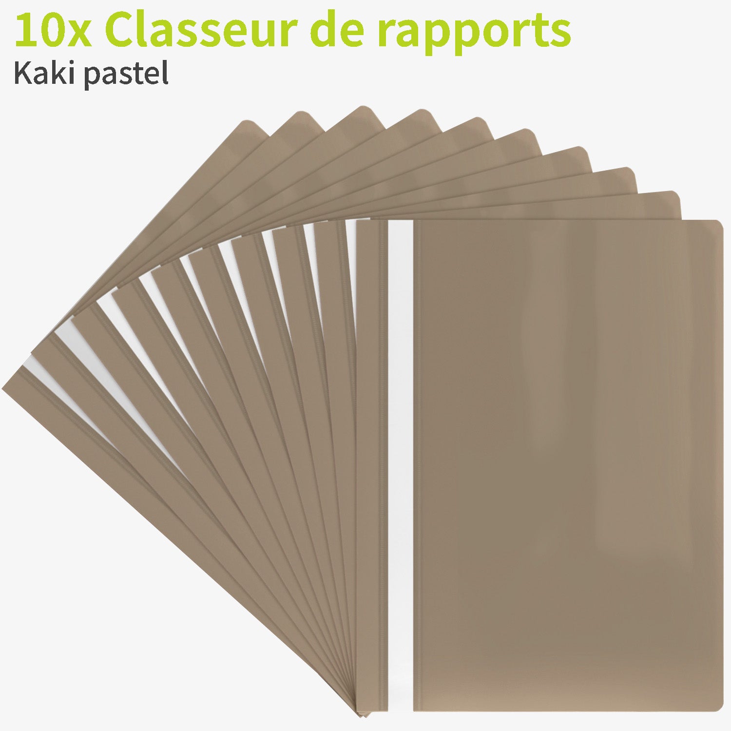 Dix chemises rapport A4 en kaki pastel pour un rangement ordonné.