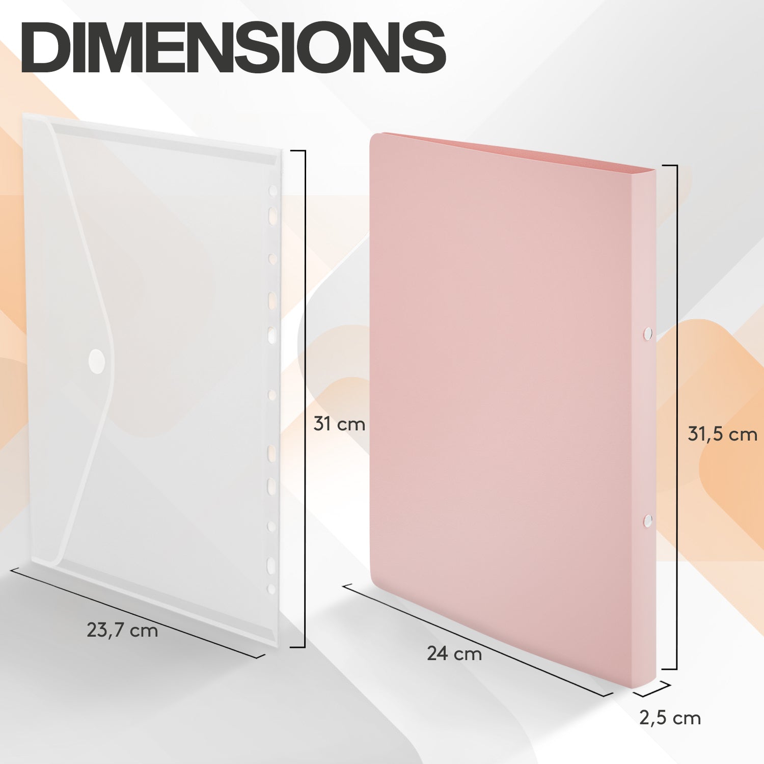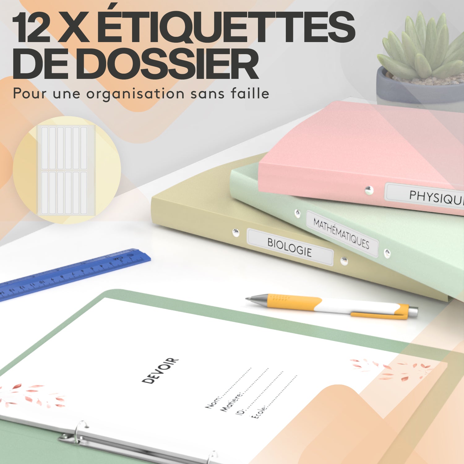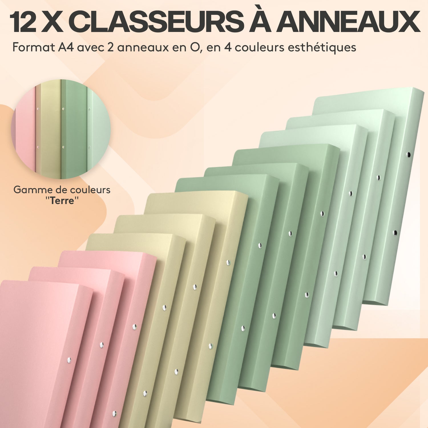 Kit complet comprenant 12 classeurs A4 Earth colors, 10 pochettes perforées, 25 protèges-feuilles et 12 étiquettes de dos—parfait pour l’école, le bureau ou la maison.