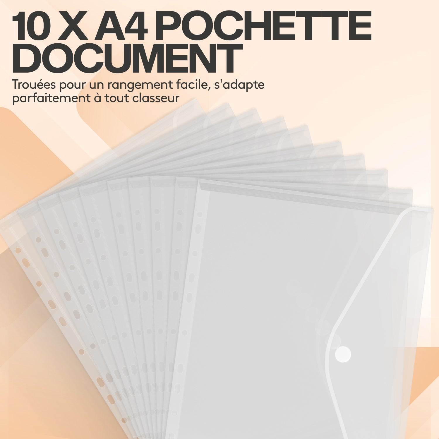 10 pochettes PP robustes, perforées 11 trous, fermeture velcro.