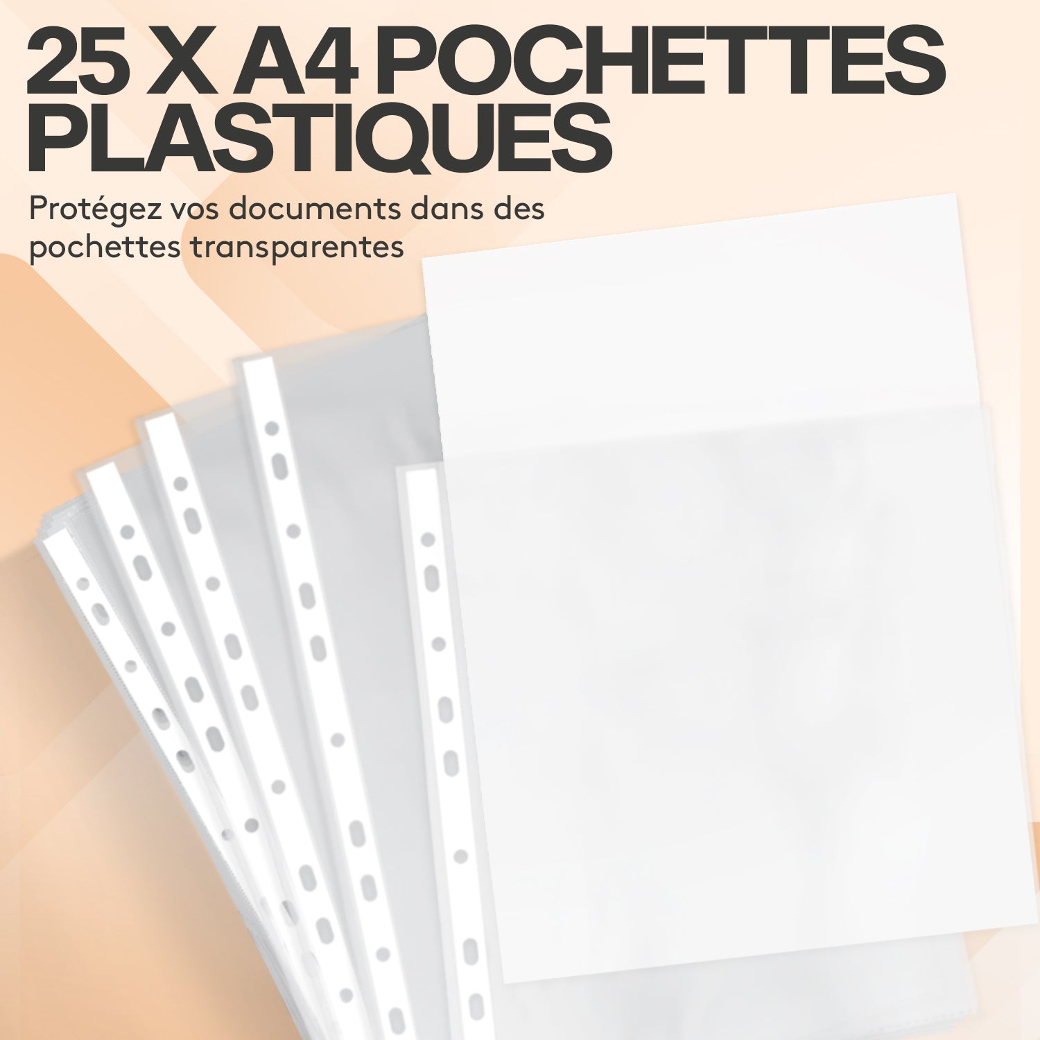 25 protèges-feuilles, 12 étiquettes amovibles et 20 intercalaires blancs.