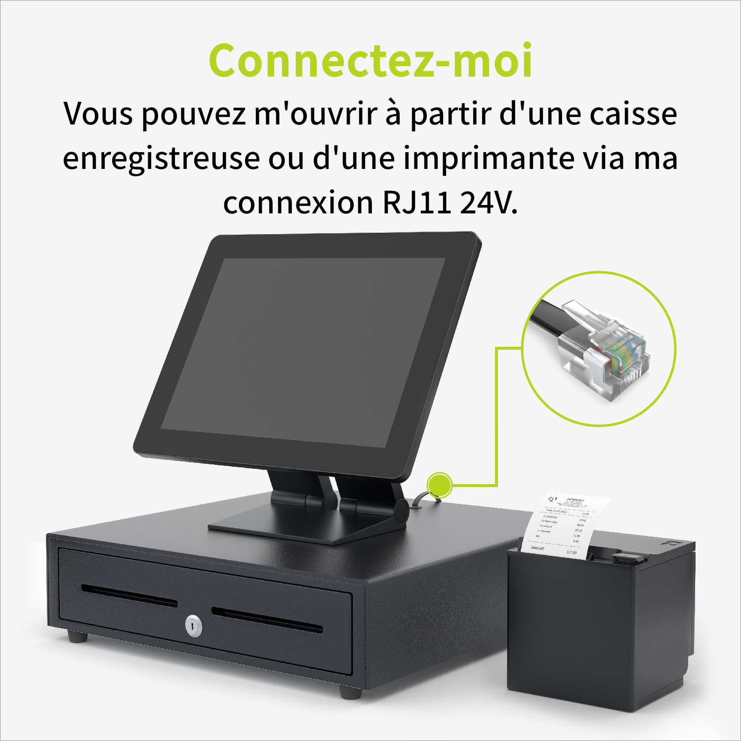 Le tiroir-caisse s'ouvre automatiquement grâce à l'appareil d'entrée via la connexion RJ11 pratique.