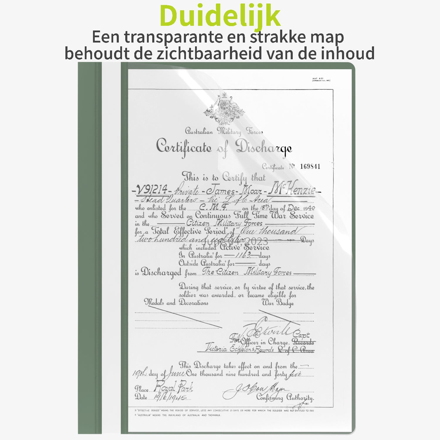 Set van 10 lichtgewicht A4 PP-rapportmappen met transparante voorkant, pastelgroene achterkant en een capaciteit van 70 vellen.
