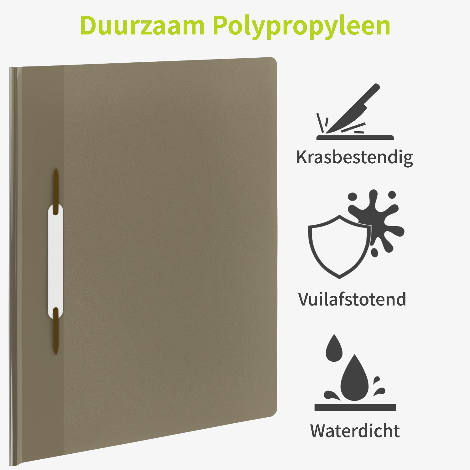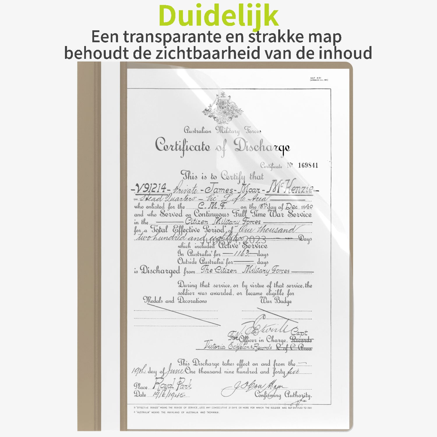 Set van 10 lichte A4 PP-rapportmappen met transparante voorkant, pastelkaki achterkant en een capaciteit van 70 vellen.