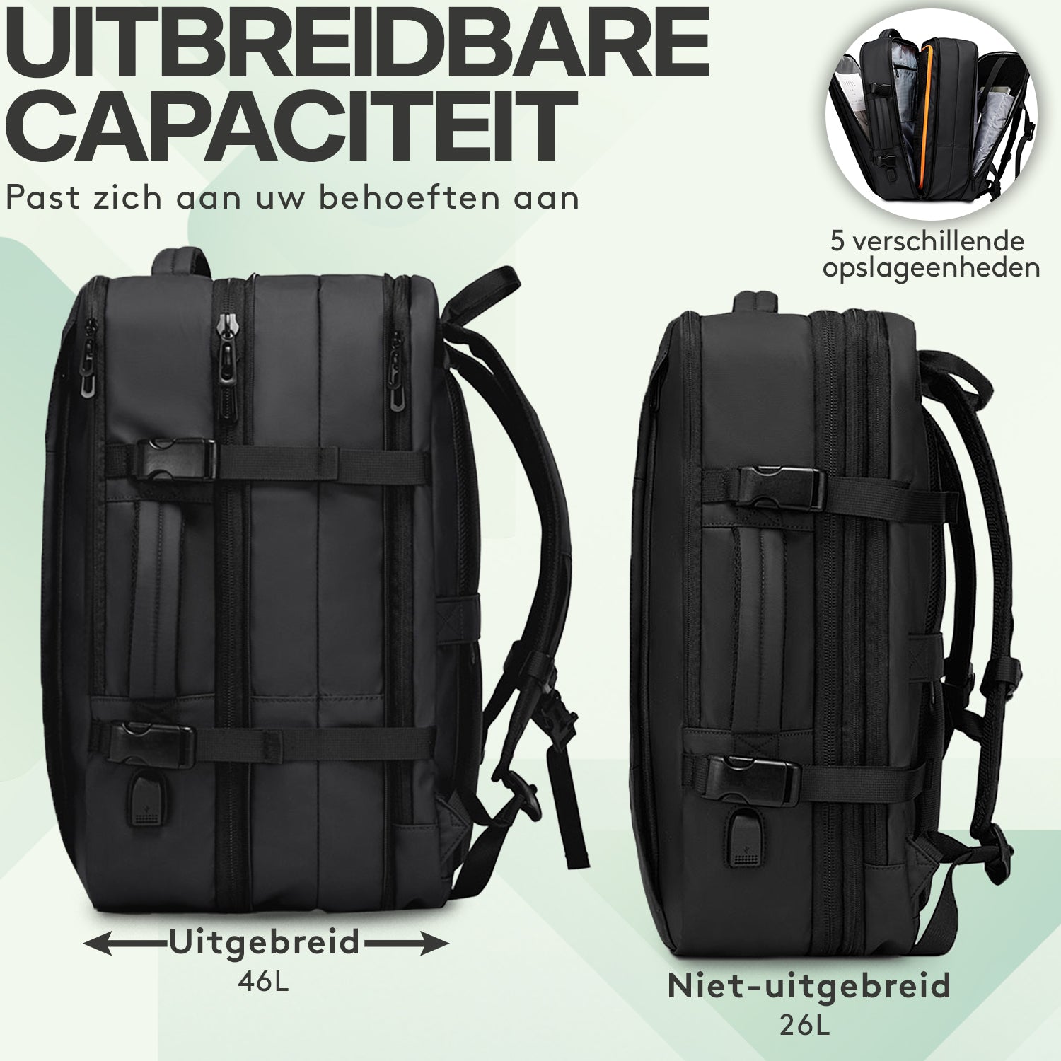 ACROPAQ Grote Uitschuifbare Rugzak 26–45L met Flessenhouder en USB-Poort – Zwart