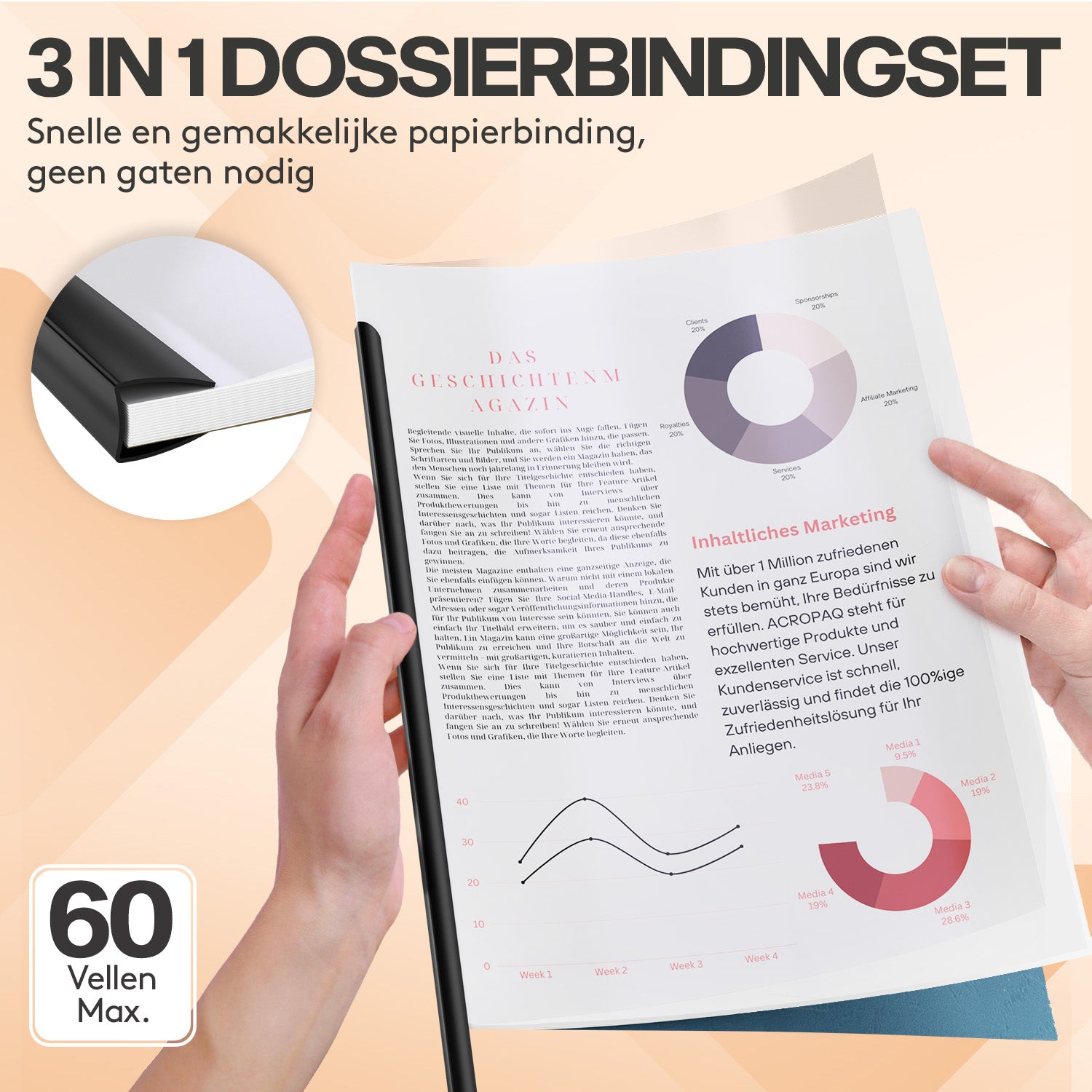 Met de ACROPAQ inbind-set kunt u snel en eenvoudig documenten inbinden zonder een inbindmachine.