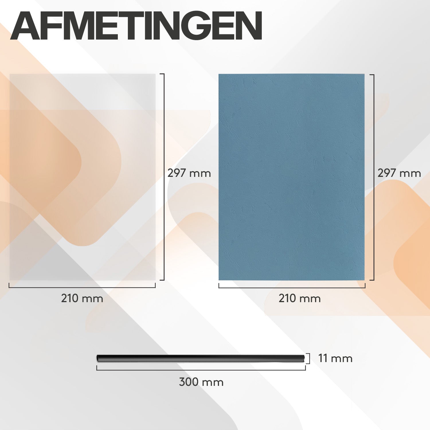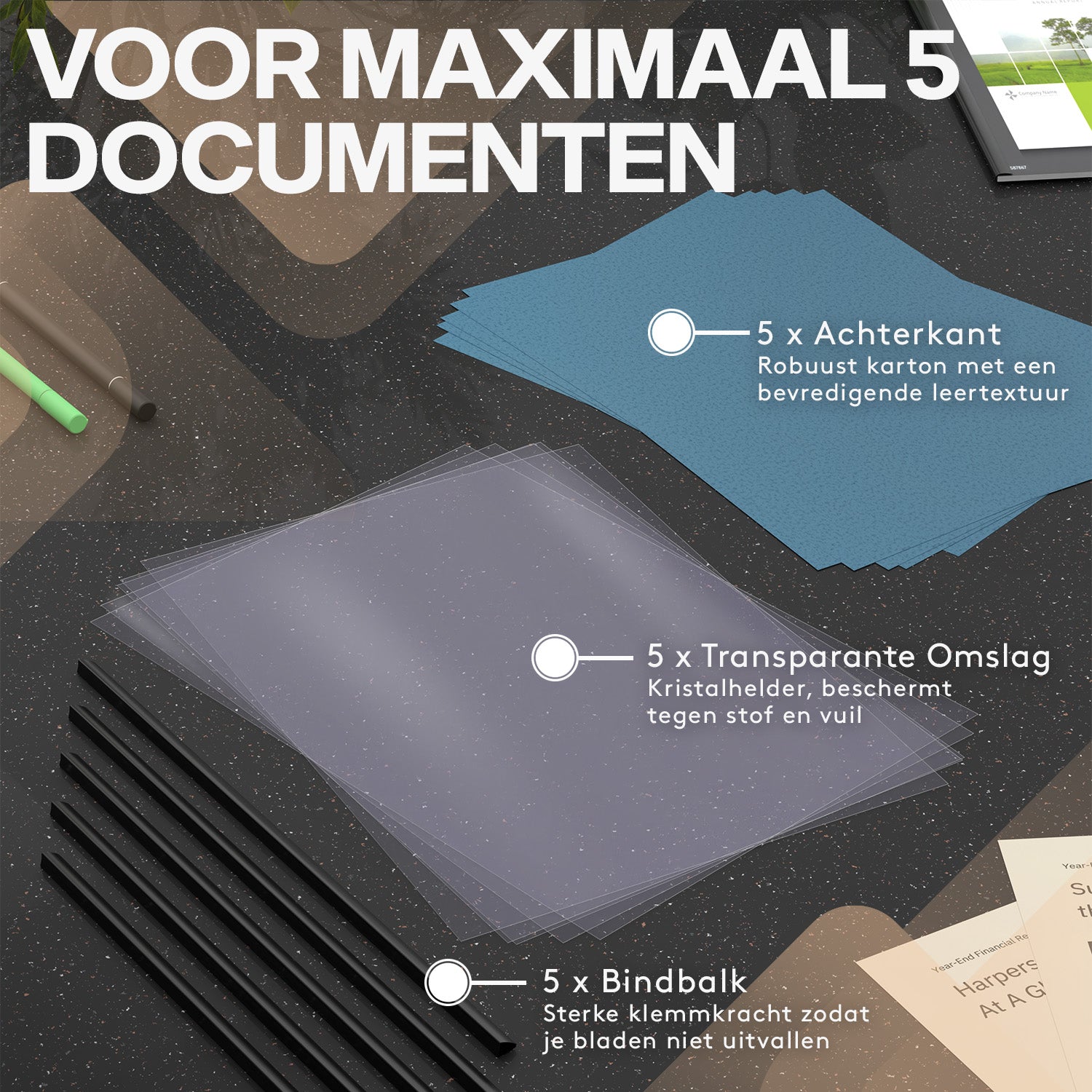 De set bevat alles wat u nodig heeft voor 5 presentaties: bindruggen, transparante voorbladen en blauwe achterbladen.