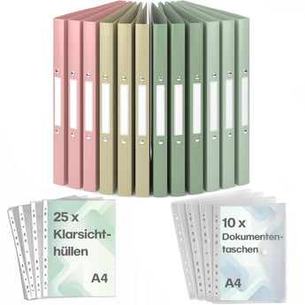 Vollständiges A4-Ablageset mit 12 Earth-Color-Ringordnern, 10 Dokumentenmappen, 25 Klarsichthüllen und 12 kleinen Rückenschildern – ideal für Büro, Schule oder Zuhause.