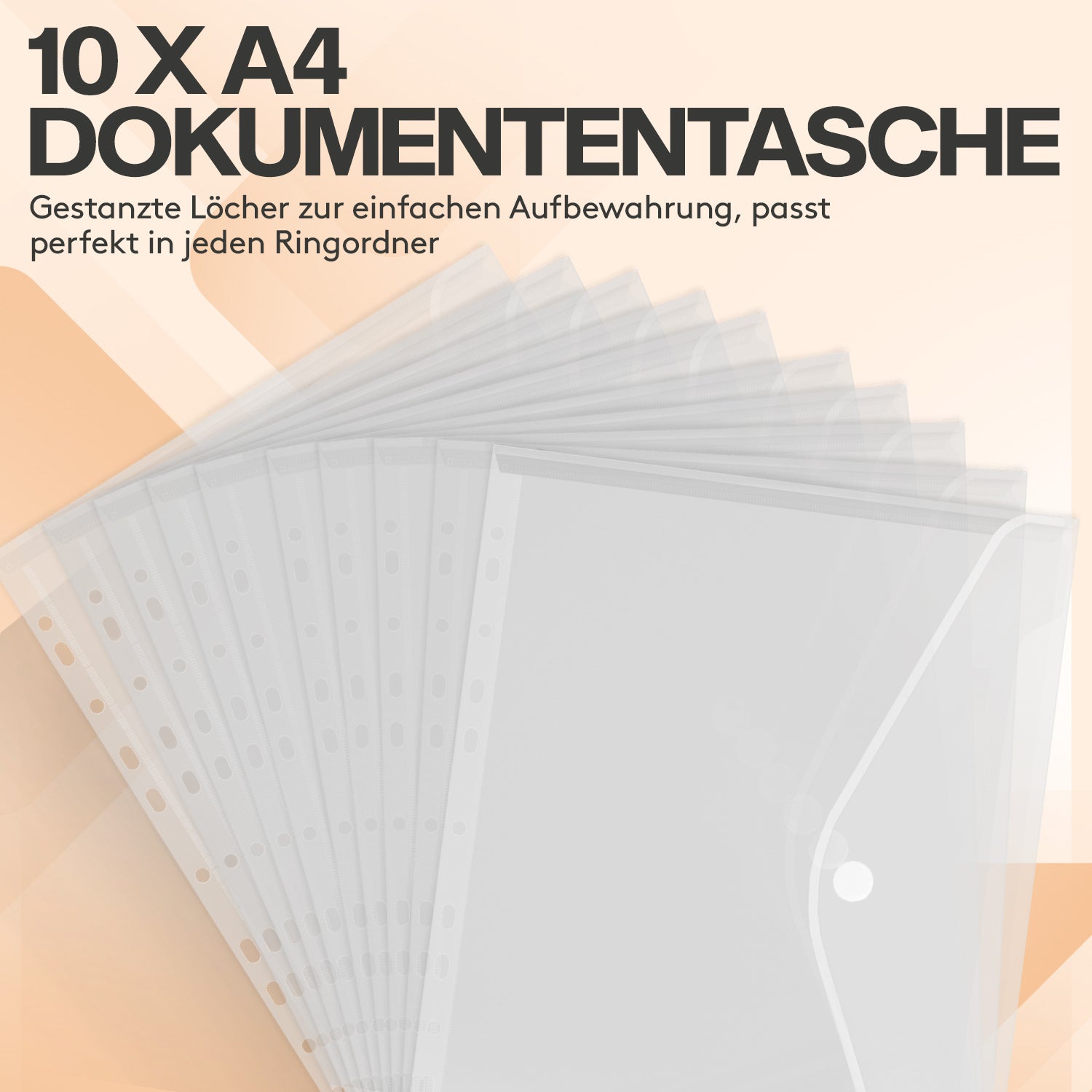10 transparente PP-Mappen mit 11 Löchern und Klettverschluss.