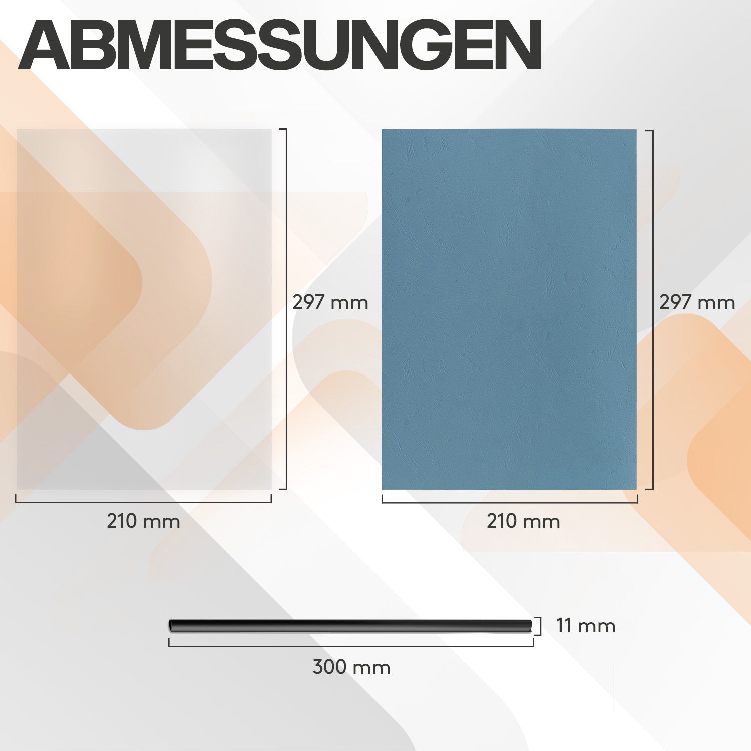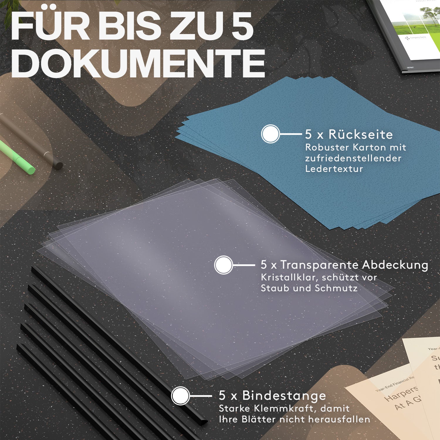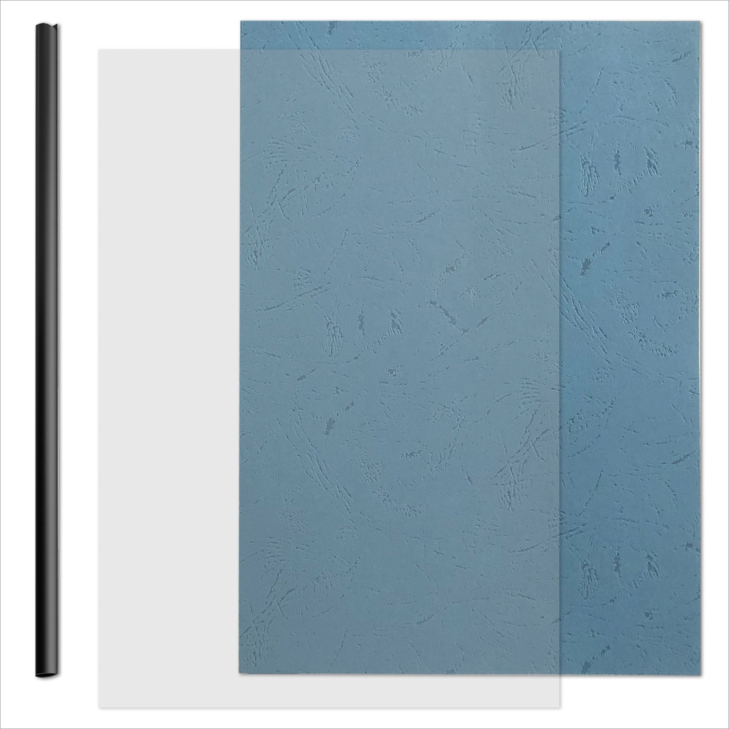 Das Set enthält alles, was Sie für 5 Präsentationen benötigen: Bindekämme, transparente Vorderdeckblätter und blaue Rückdeckblätter.