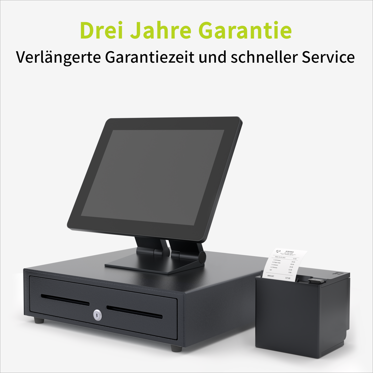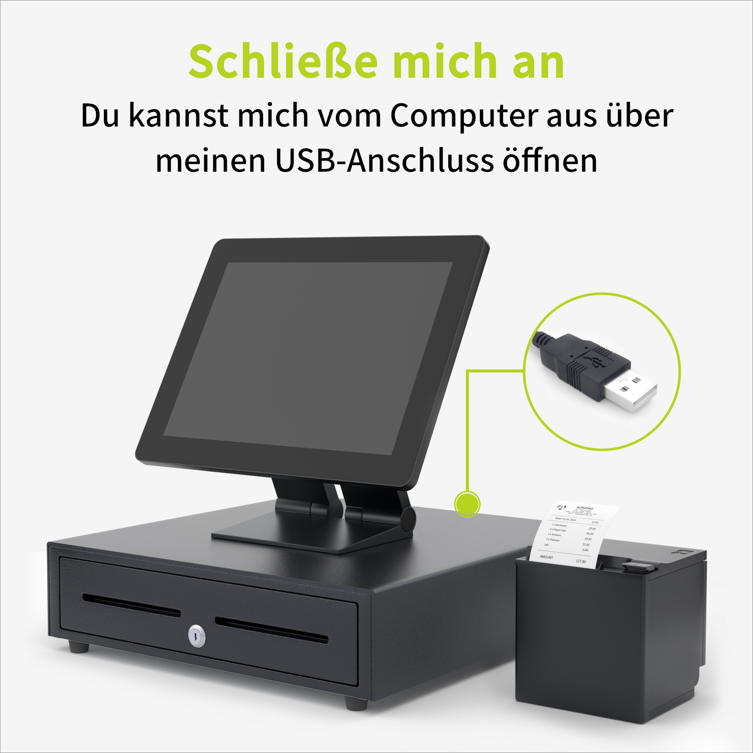 Automatische Öffnung der Kassenschublade durch das Eingabegerät dank des praktischen USB-Anschlusses. Getestet auf mindestens 1,5 Millionen Öffnungen.