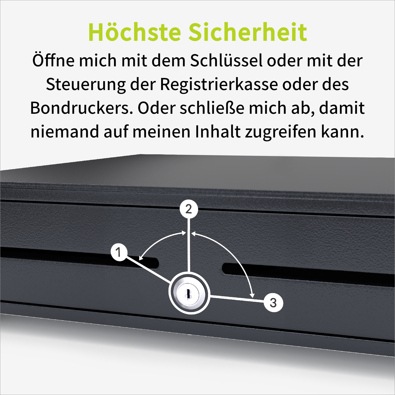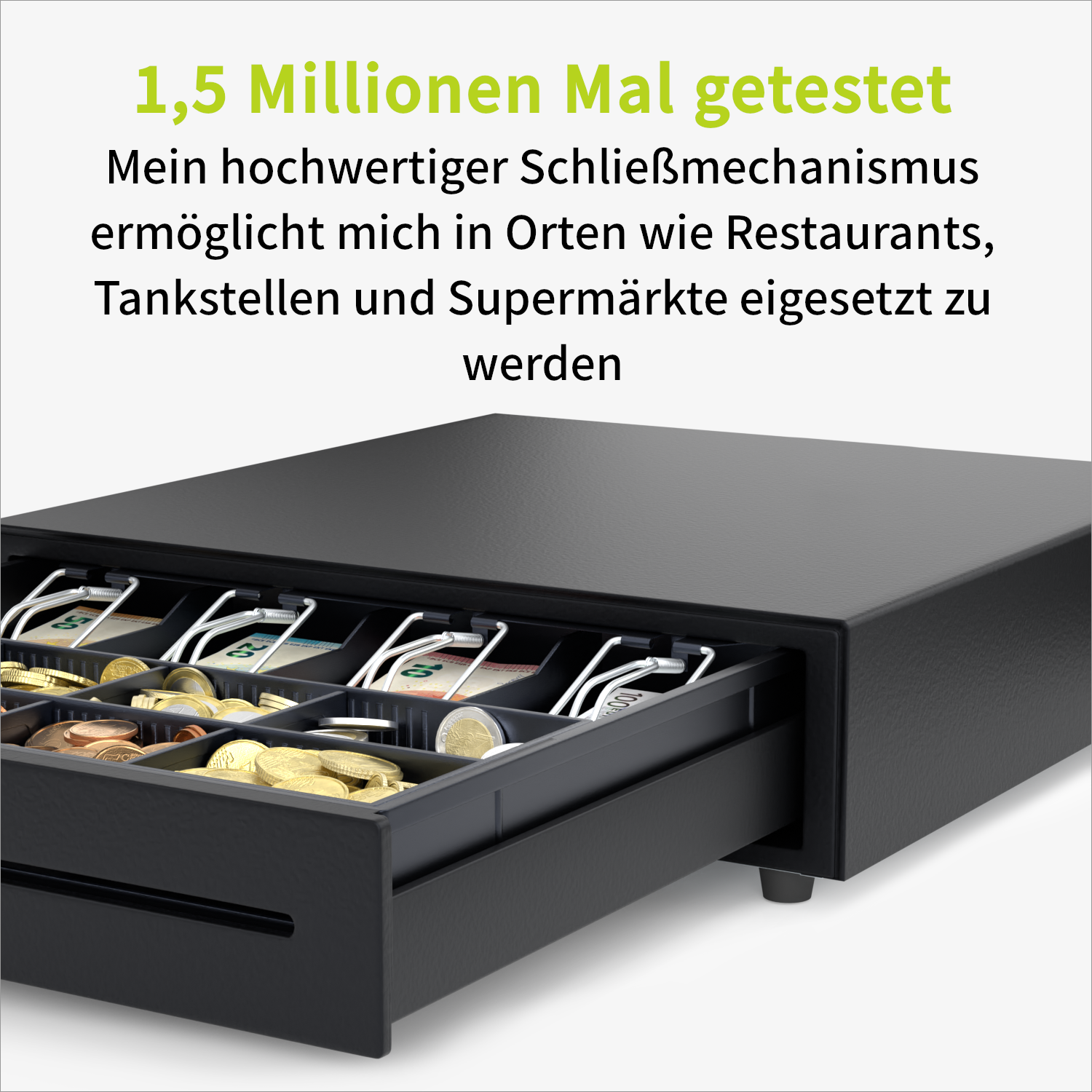 Die Kassenschublade ist aus robustem und stoßfestem Stahl gefertigt.