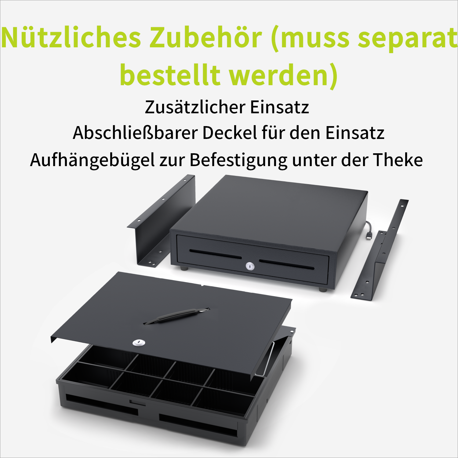 Diese Kassenschublade ist ideal für jedes Unternehmen. Mit 8 Münz- und 4 Geldscheinfächern können Transaktionen schnell und effizient abgewickelt werden. Elektrische Öffnung über USB-Anschluss, robustes Material, getestet für über 1,5 Millionen Öffnungen.