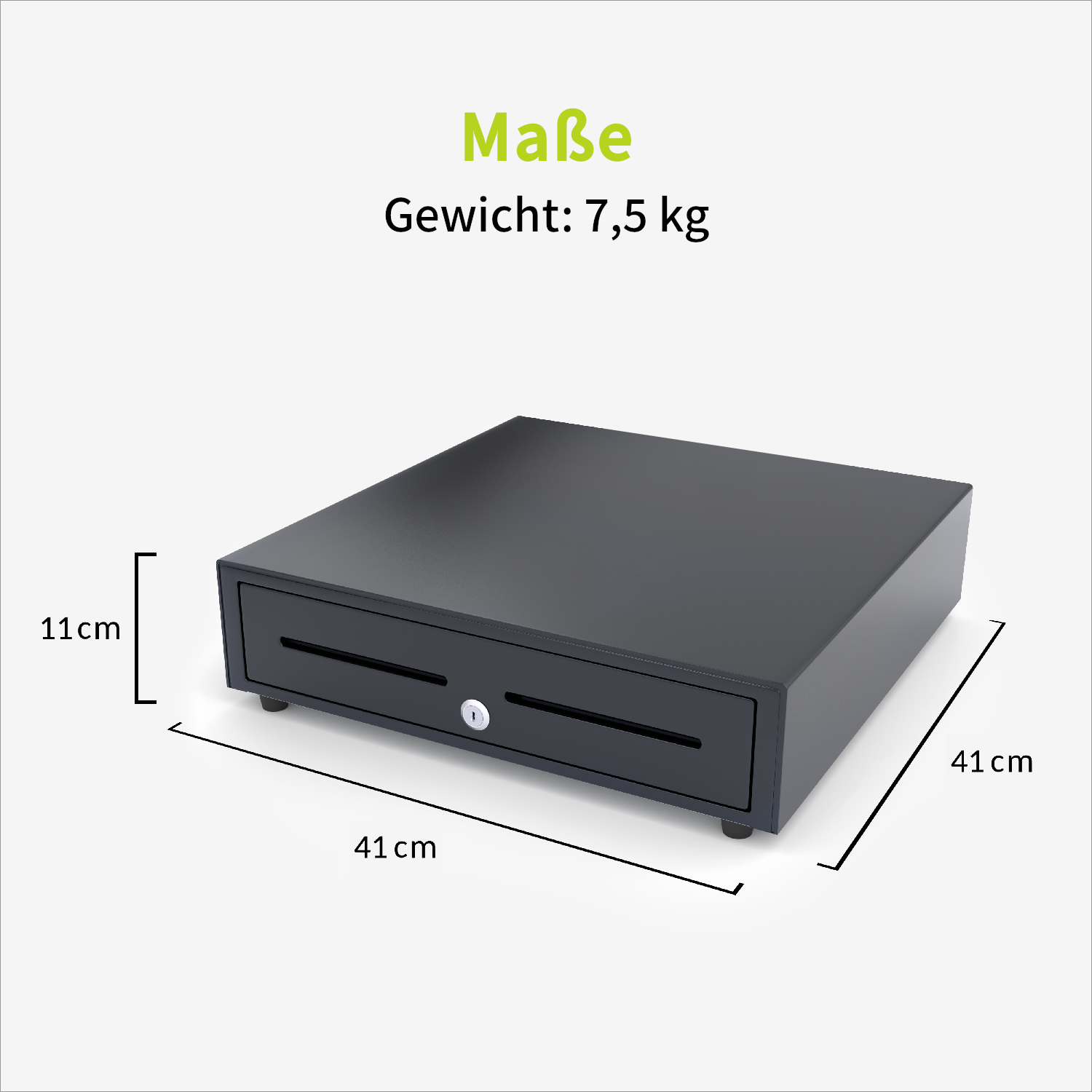 Mit den kompakten Abmessungen von 41 x 41 cm kann die Kassenschublade leicht unter dem Tresen oder Tisch installiert werden.