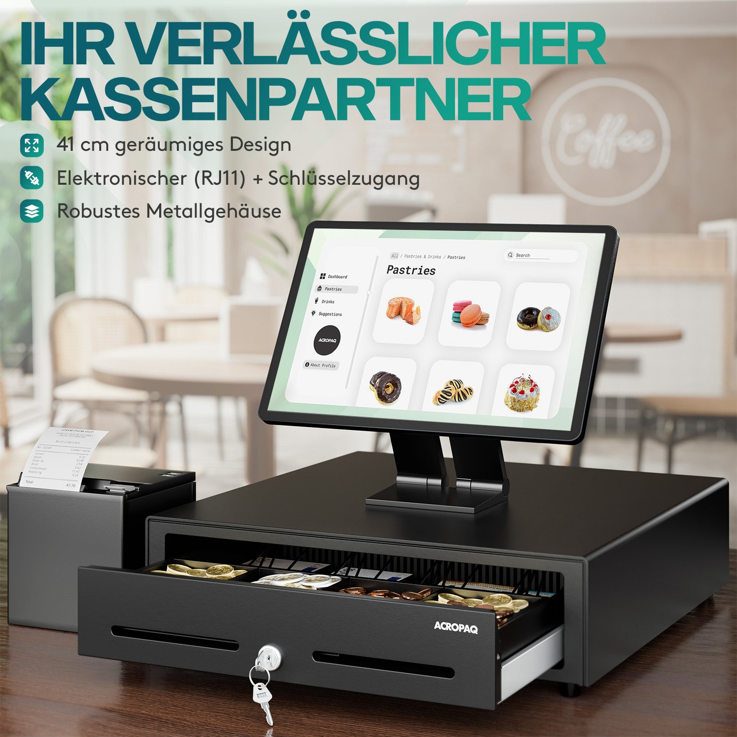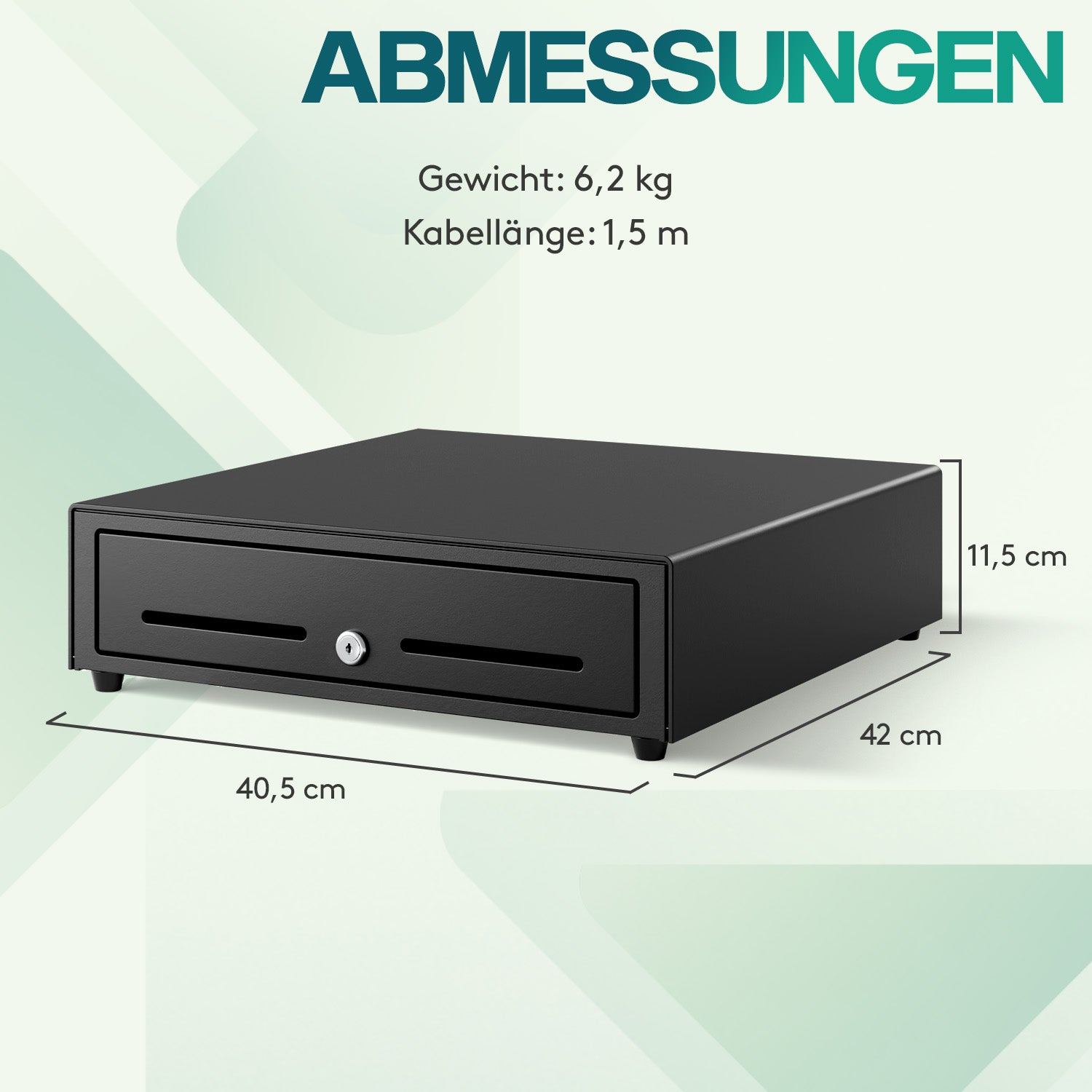 Maße 410 x 415 x 115 mm – optimaler Stauraum bei Kassentresen-Kompatibilität.