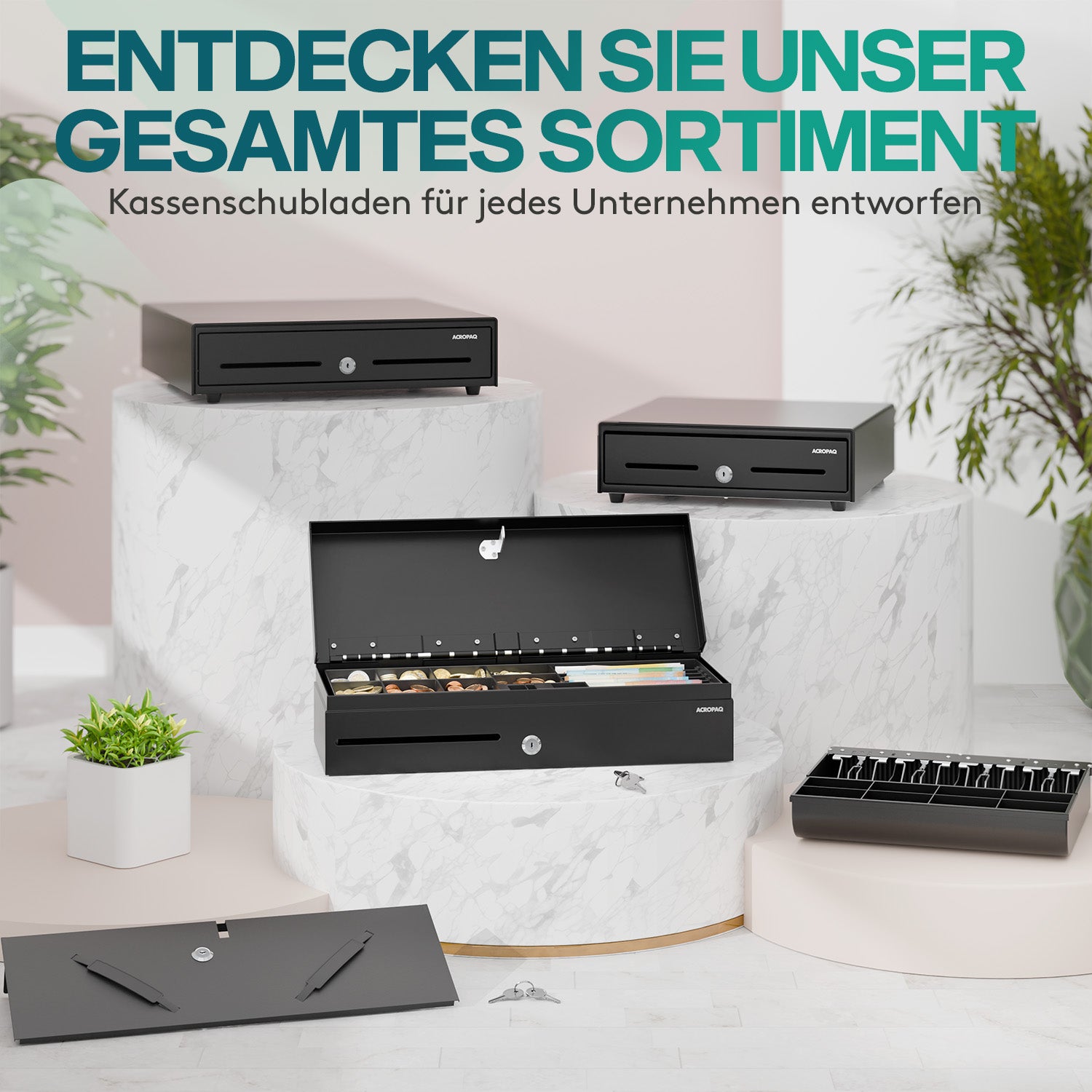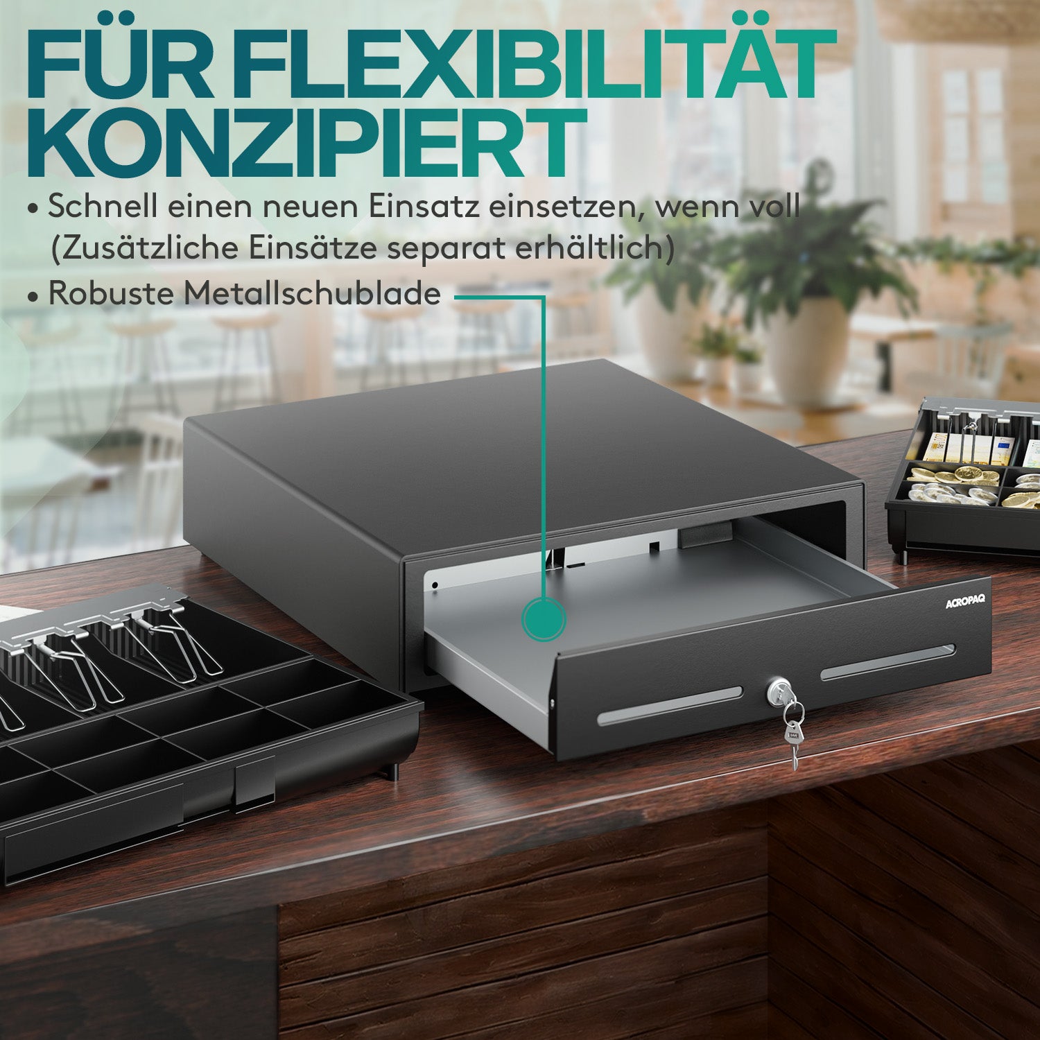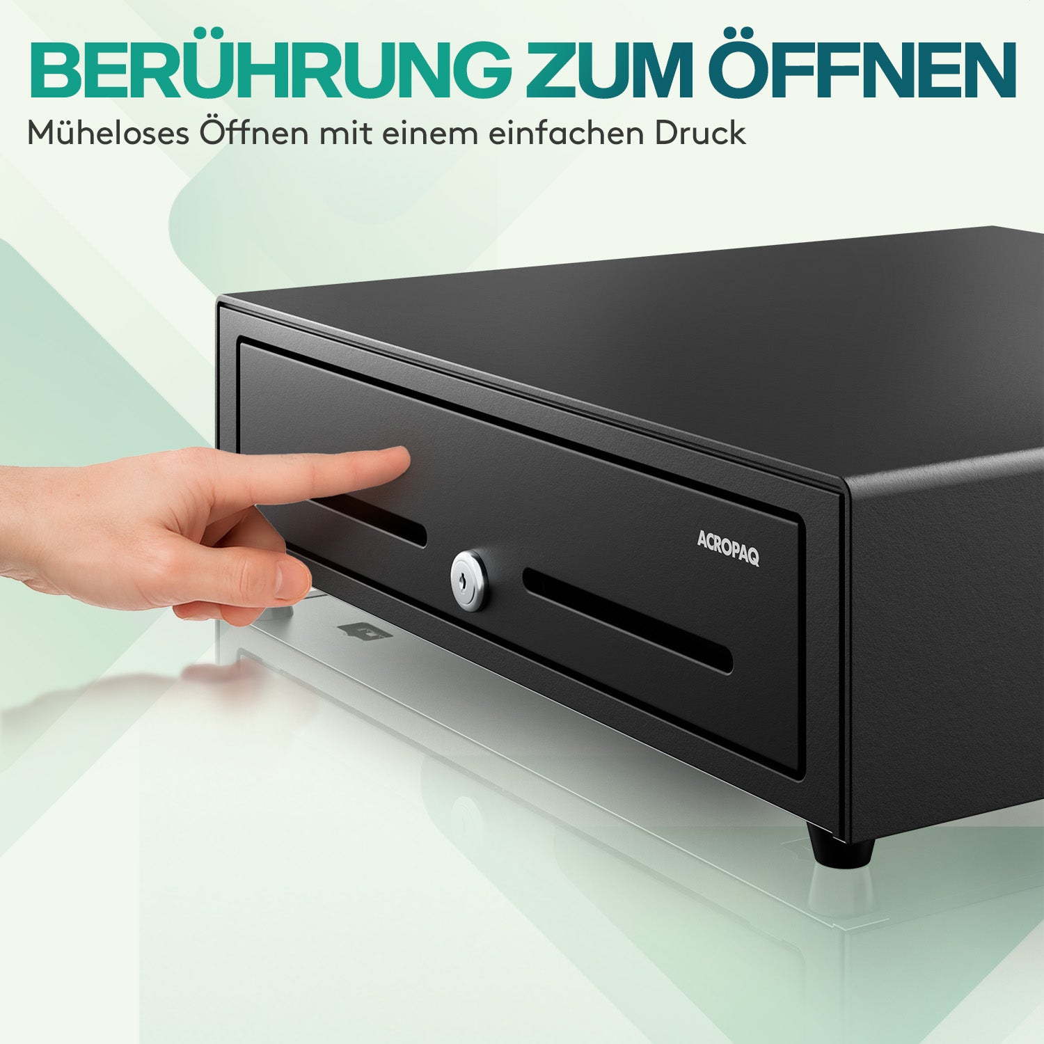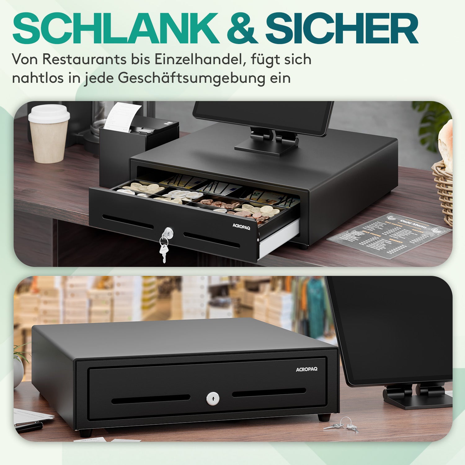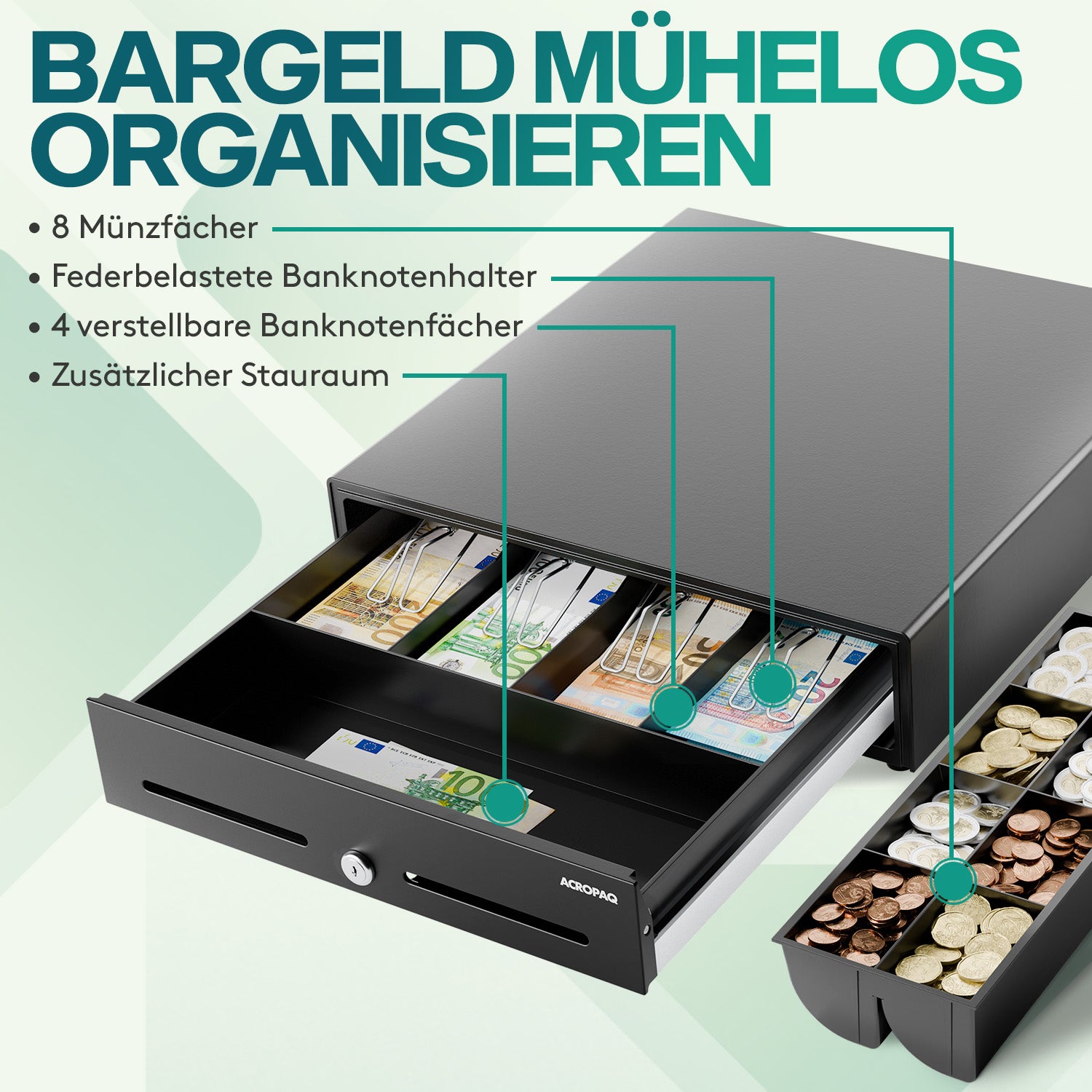 ACROPAQ Kassenschublade - Kassenlade mit Drucköffnung, 8 Münzfächer, 4 Scheinfächer, Robustes Metallgehäuse, Schwarz - 42 x 41 x 10 cm