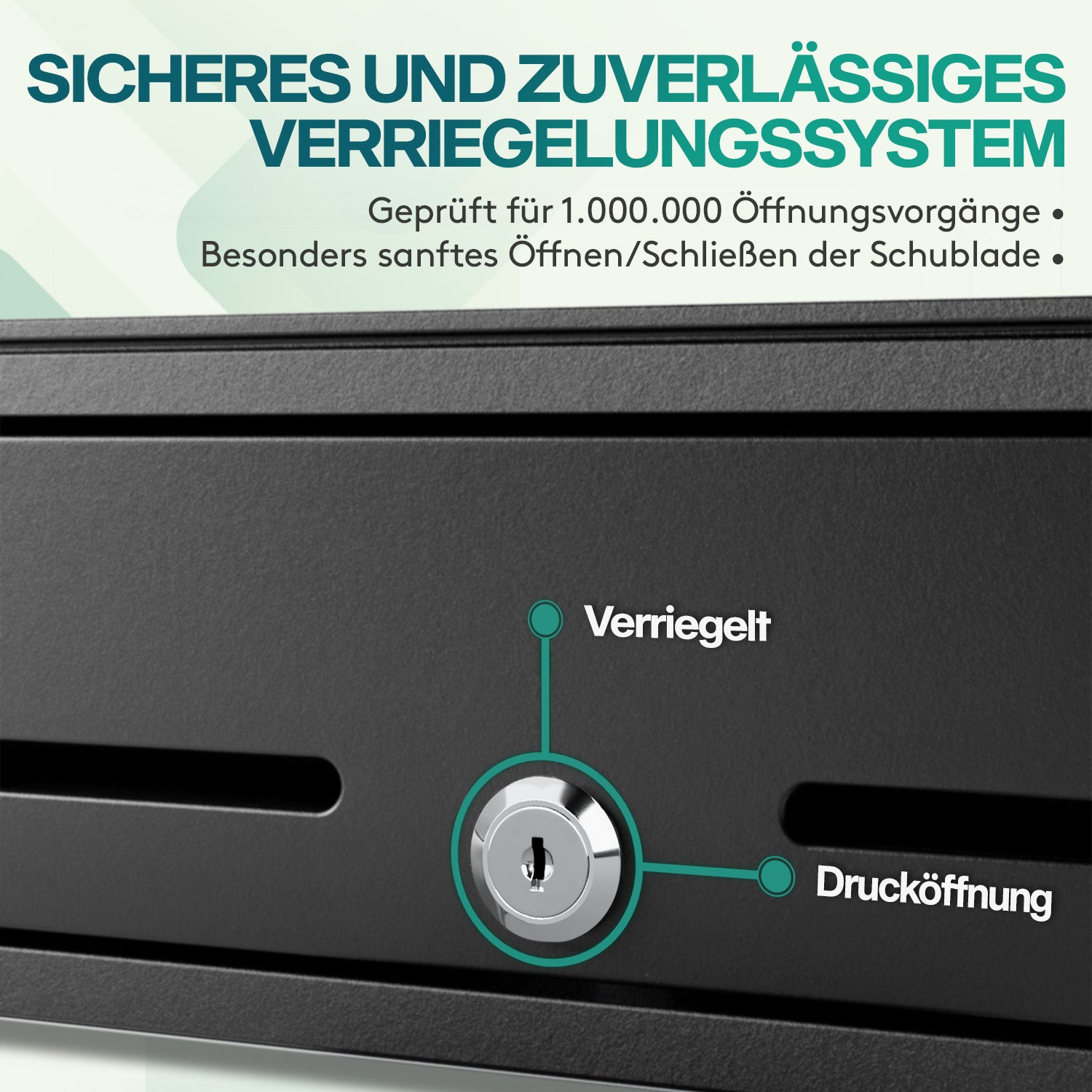 Robustes Metallgehäuse für über 1.000.000 Öffnungen – ideal für stark frequentierte Kassenbereiche.